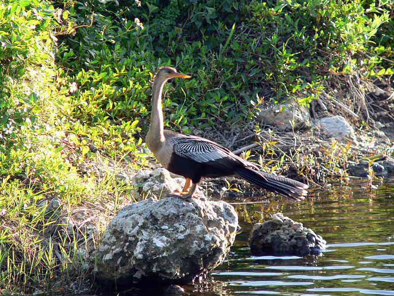 anhingaThe anhinga is a large bird that is about three feet in length. It has a long S-shaped neck and a long pointed bill. It has large wings with silver-white feathers on the top side. The male has grayish-black feathers with a greenish shine to them. The female has a tan head, neck, and chest, and a black stomach. Both the male and the female have long, fan-shaped tail feathers. When the anhinga is in its breeding plumage it has a blue ring around its eyes.