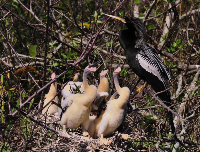 anhingaThe female lays 3-5 light blue eggs and both parents incubate the eggs for about a month. The chicks are blind and helpless when they hatch. Both the male and female feed them regurgitated food. The chicks fledge when they are six weeks old, but they stay with their parents for a few more weeks. Male and female pairs may mate for more than one year and often use the same nesting site.