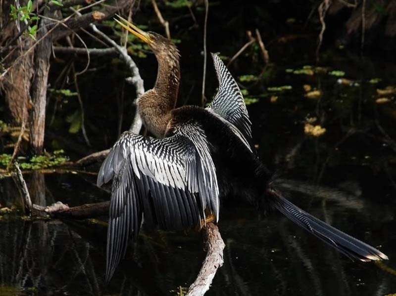 Anhingas can be found in freshwater ponds and swamps where there is thick vegetation and tall trees.