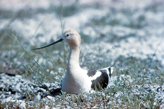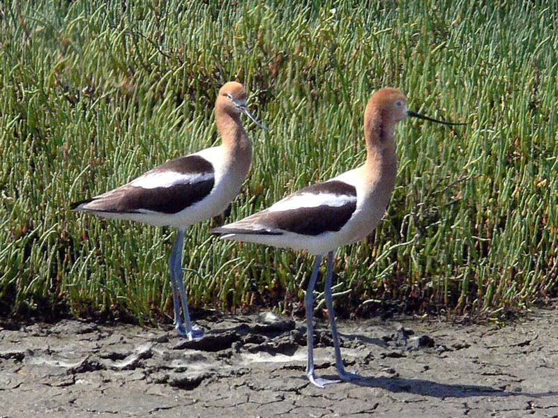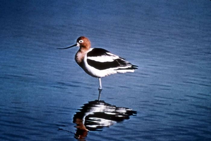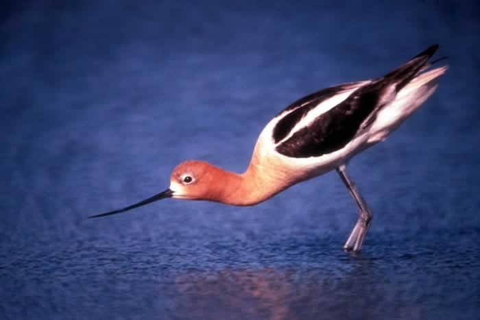 AvocetThe American avocet is a large shorebird. It is 16-20 inches tall and has very long, grayish-blue legs; a long neck; and a long, turned-up black bill. The female's bill turns up a little more than the male's bill. Its head and neck are rusty-red in the summer and grayish-white in the winter. It has black wings with white stripes and a white body.