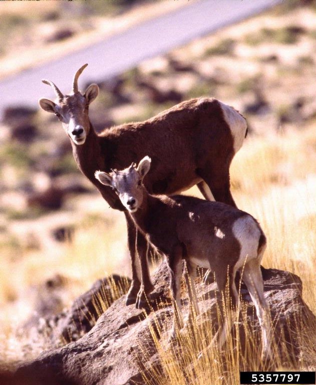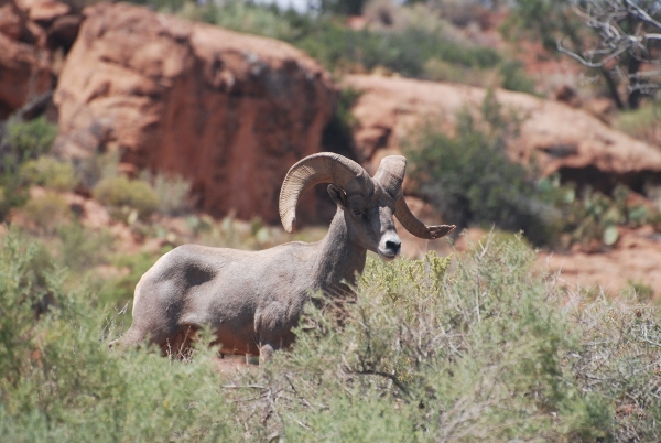 Bighorn SheepThe bighorn sheep has tan or brown fur. It has a white belly, rump, and muzzle. It is best known for its large horns. The ram has large, thick curving horns.