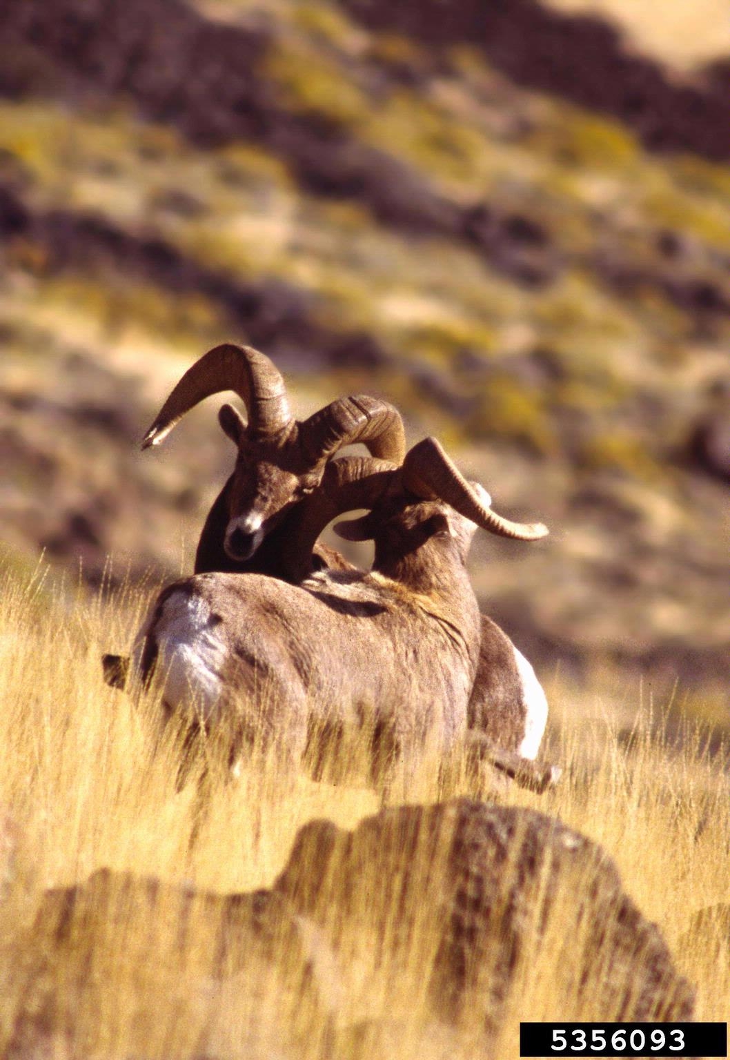 Bighorn SheepIn the fall, males  have head butting contests to establish dominance. They run at each other at speeds of up to 20 miles an hour and ram their heads together. A ram usually only fights with another ram who has horns that are about the same size as his horns. Head butting contests can last as long as 20 hours! The dominant ram will mate with more females than the other rams.