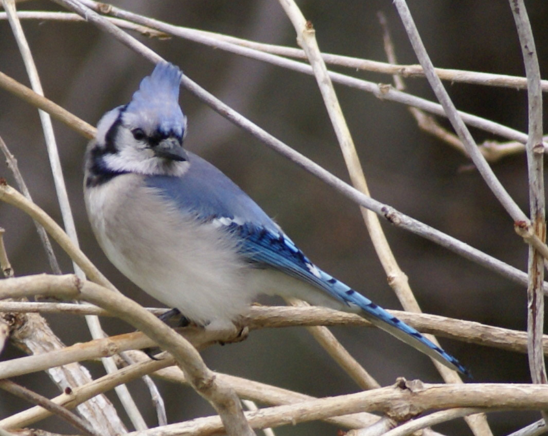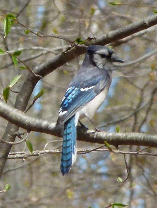 Blue JayThe blue jay is between 9 and 12 inches in length. It is bright blue on top and white to gray on its throat, chest and belly. It has a gray-blue crest on its head and black and white bars on its wings and tail. Its bill, legs and feet are black. It also has a black "necklace" on its lower throat.