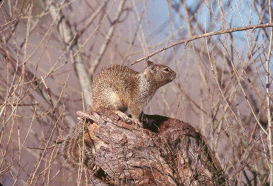 California Ground SquirrelThe California ground squirrel is diurnal, that means it is most active in the daytime. It lives in colonies, but the squirrels tend not to socialize with each other. Several squirrels may share a burrow, but they each will have their own entrance. Burrows are made under a tree, log or rock. The California ground squirrel can climb trees, but it spends most of its time on the ground.