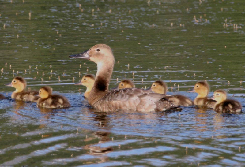 The female incubates the eggs and cares for the young. The eggs hatch in about 24 days and the ducklings fledge when they are