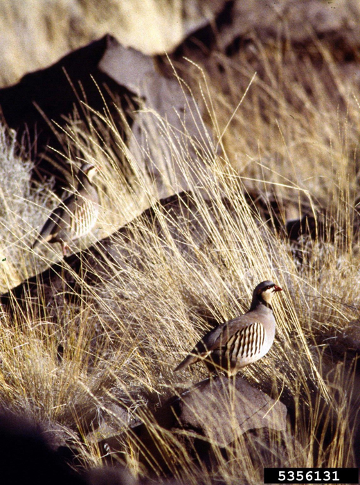 The chukar rarely flies. It is a good runner and can also hop across the rocky terrain in its habitat. Except for during breeding season, chukars live in coveys of up to 40 birds.