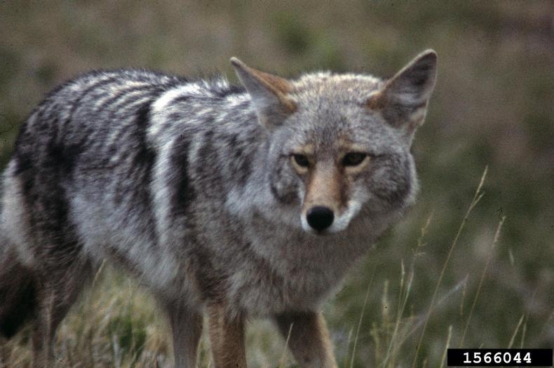 The coyote has grayish-brown to yellowish-brown fur on top and whitish fur on its underparts. It has large triangular ears on the top of its head and a long, narrow muzzle. It has a black nose; yellow eyes; and a long, bushy tail.
