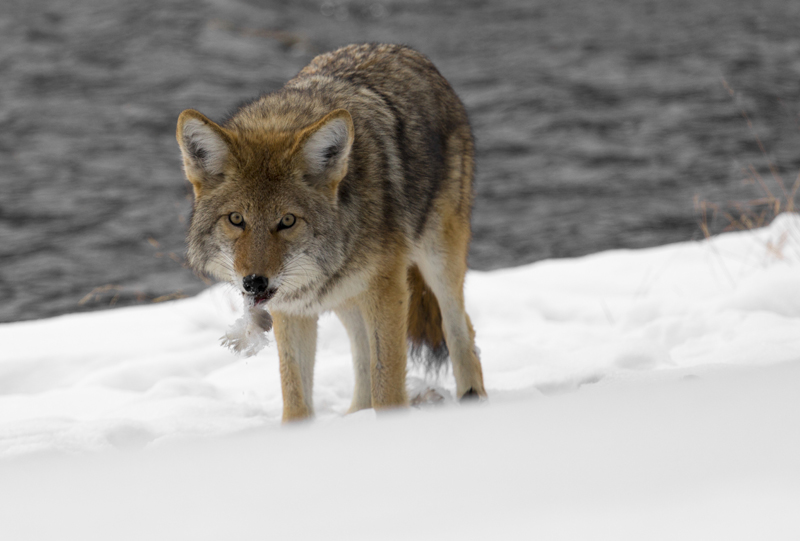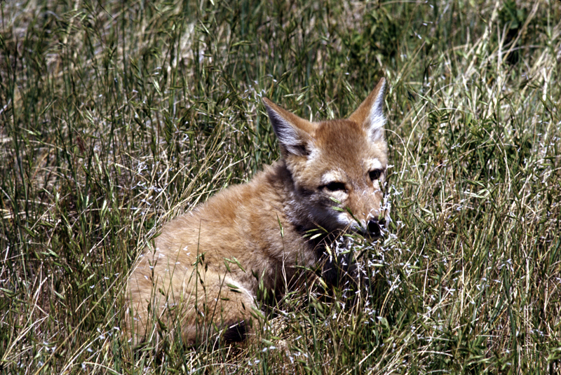 When hunting small prey like mice, the coyote stands still with its legs stiff and then pounces on its prey. When hunting larger prey like deer, coyotes hunt in packs. One or more coyote chases the deer while the others wait; then the next group will pick up the chase. Working in teams like this the coyote can tire the deer out, making it easier to kill. Coyotes also often follow badgers and catch animals that pop out of the burrow the badger is digging. |