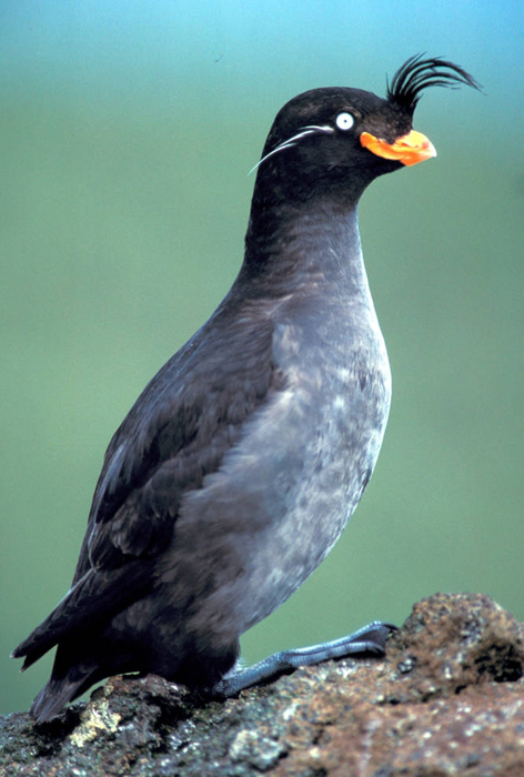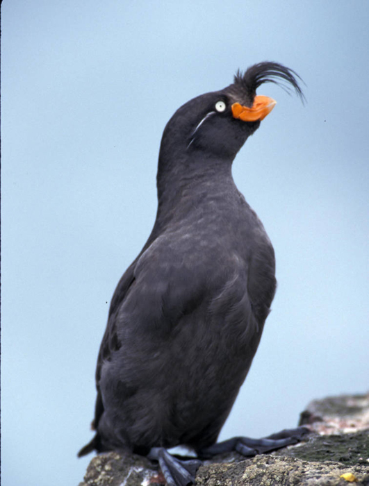 Crested AukletThe crested auklet is a stocky seabird that is about nine inches tall. It has dark brown to black feathers.