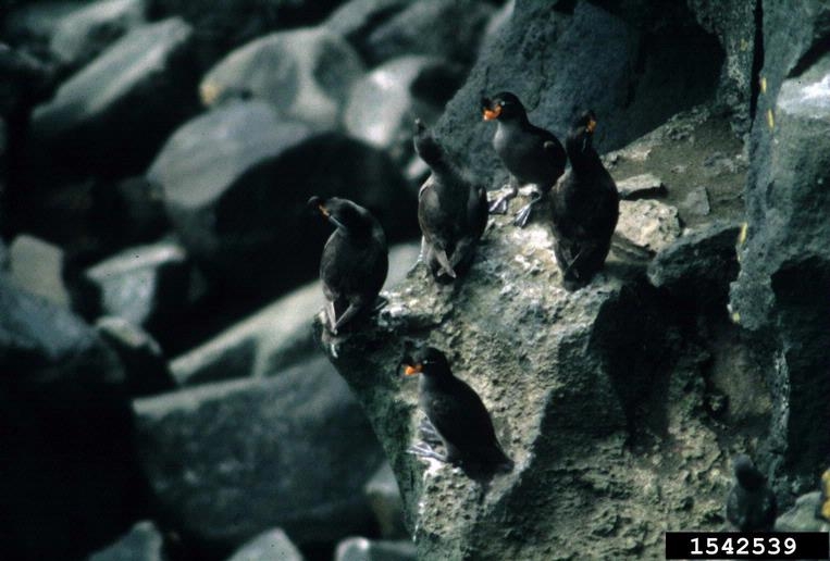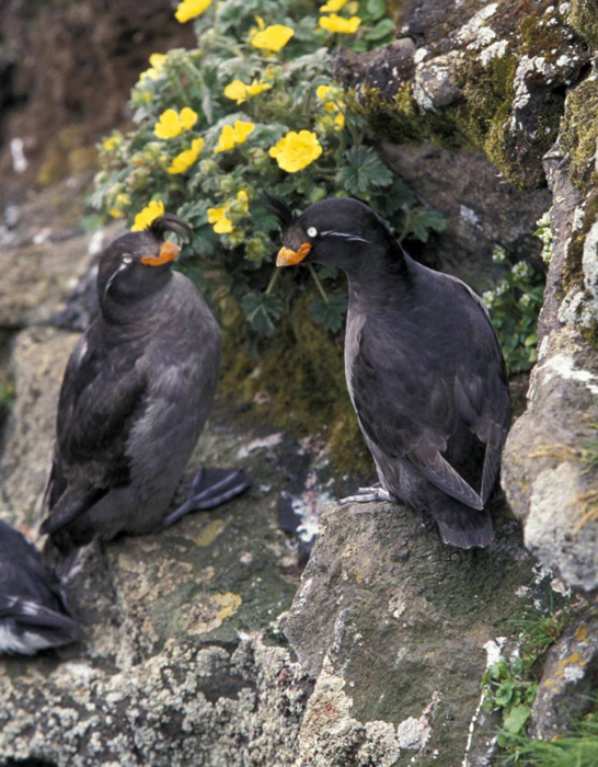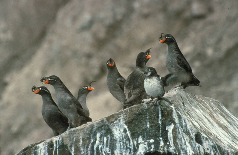 Crested AukletThe crested auklet nests on island coasts with lots of rocks and boulders. In non-breeding season, it live on the open ocean.