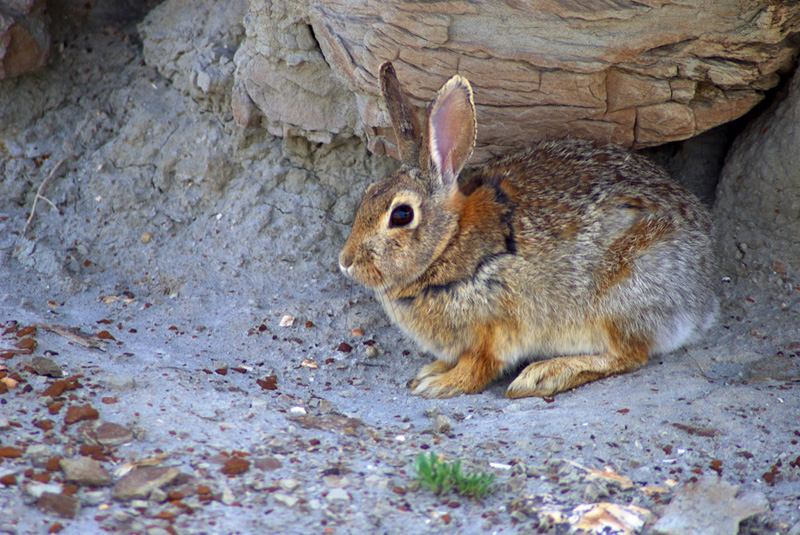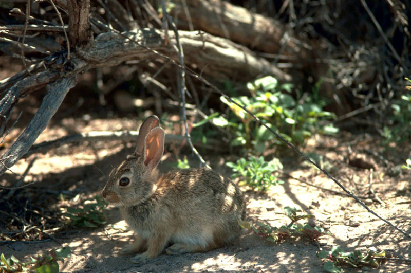 The desert cottontail can be found in woodlands, grasslands, creosote brush and desert areas.