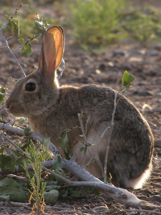 The desert cottontail eats grasses, cacti, bark and twigs and mesquite. |