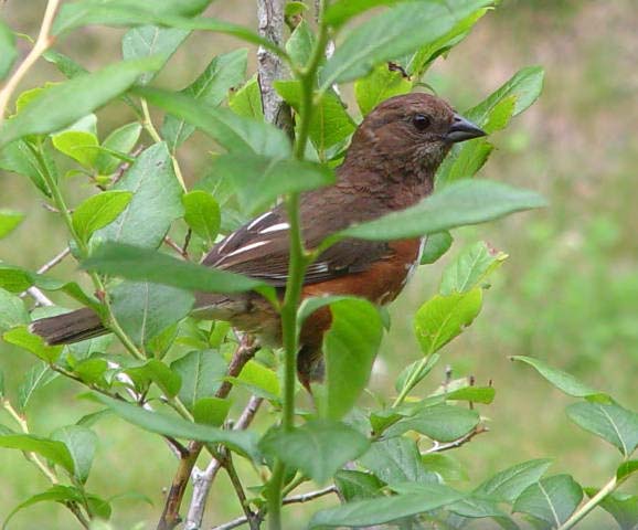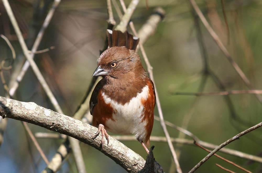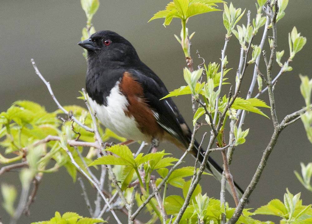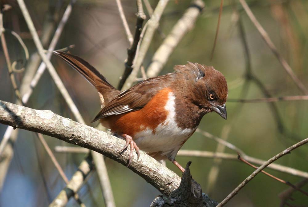 The eastern towhee lives in thickets and at the edges of brushy woodlands.