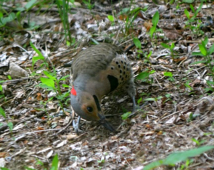 The flicker is the only woodpecker in North American that commonly finds food on the ground. It often forages for ants and beetle larvae on the ground. It will sometimes perch on tree limbs to eat berries. |