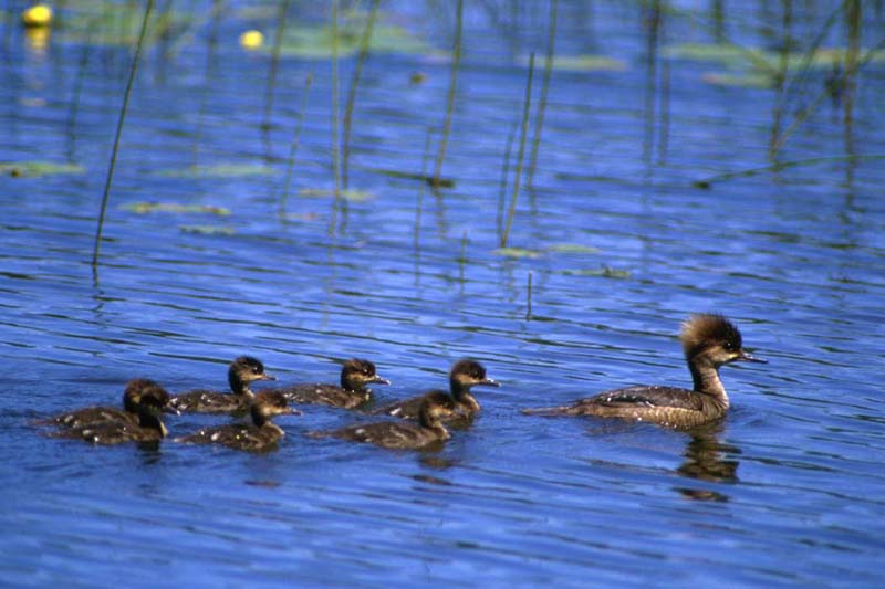 The hooded merganser usually gathers in small groups of no more than 10 or 12. When they are startled, they will fly away. They are one of the fastest flying ducks.