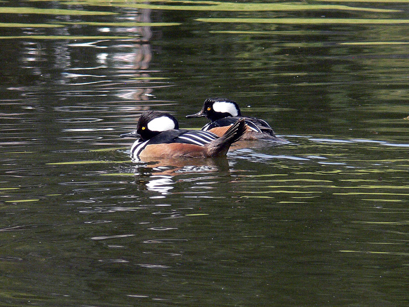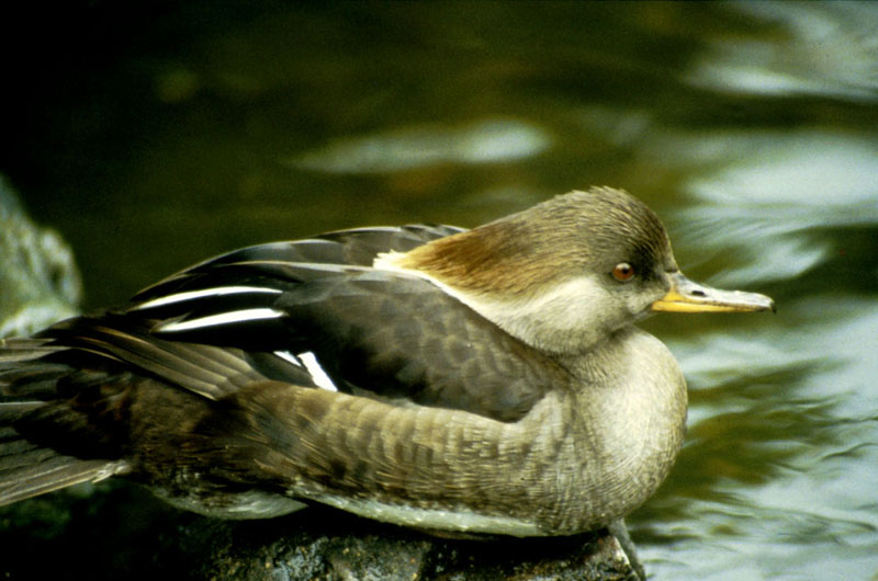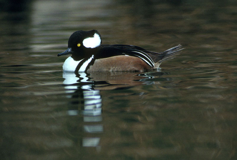 The adult male hooded merganser has a white fan-shaped crest on his head. He has bright yellow eyes, a black head, a white chest with two black stripes, a brownish-black back, rust-colored sides, and a grayish-brown rump and tail.