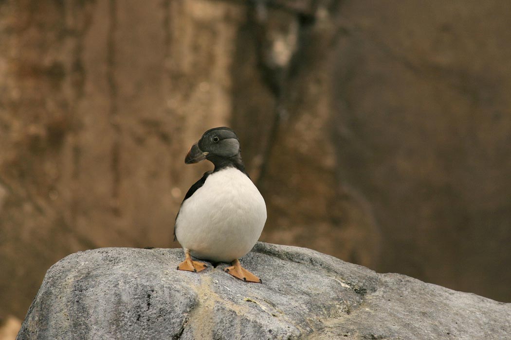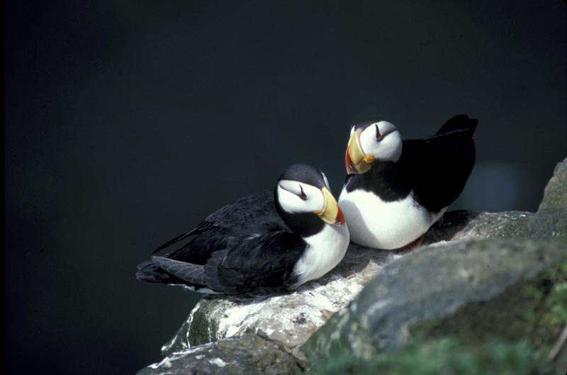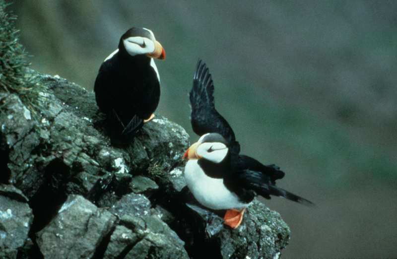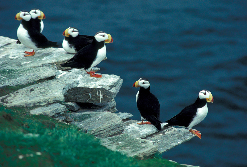 In order to get airborne, the puffin must run on the surface of the water for a long distance. The horned puffin will also will dive off cliffs to take flight.