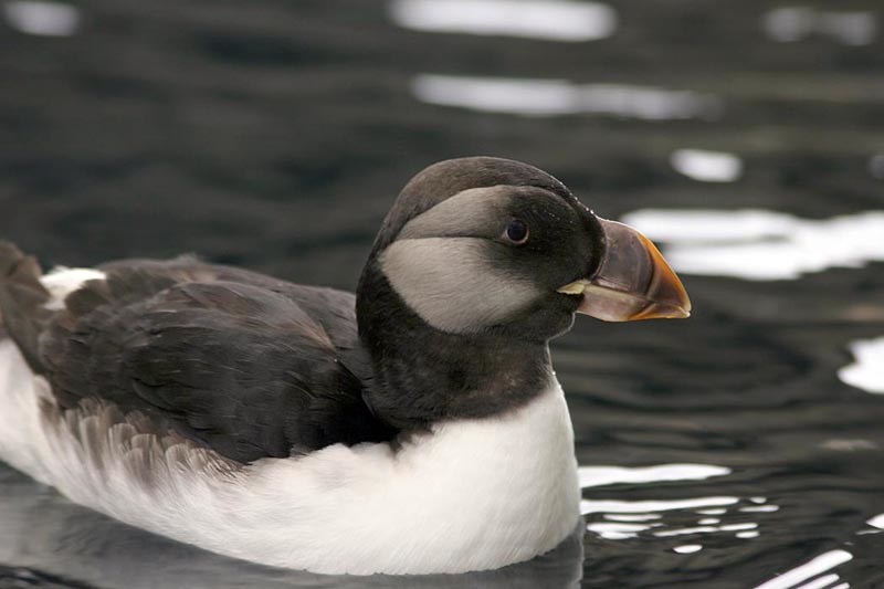 The horned puffin is a small, pigeon-sized bird with black uppersides and a white chest and undersides. It has a white face and cheeks with a small black "horn" above its eyes and a