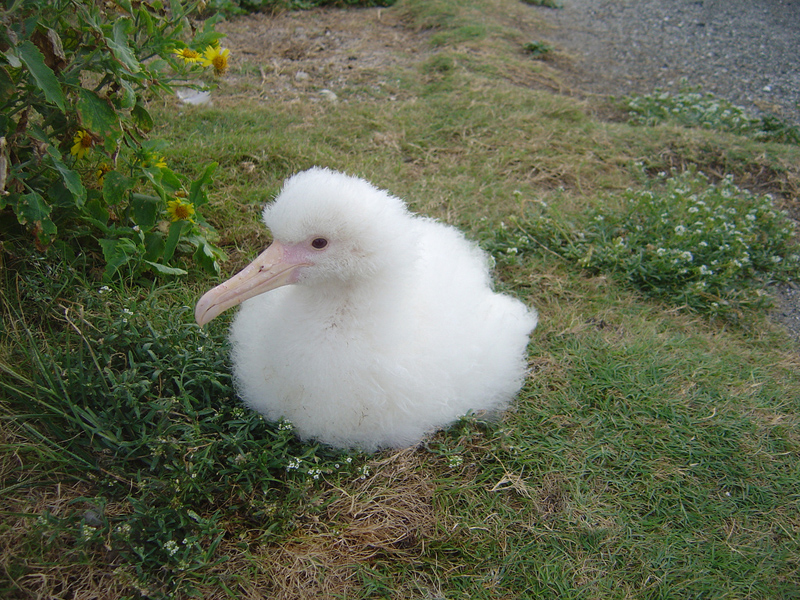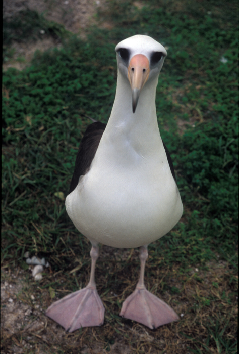 The Laysan albatross is a little more than two feet in length and has a wingspan of over six feet. It has black wings and tail, a white head and body, pink legs, and webbed feet.