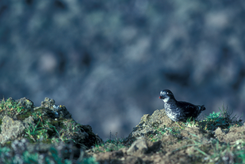 The least auklet nests on rocky coasts with lots of rocks and boulders. It lives on the open ocean when it is not mating season.