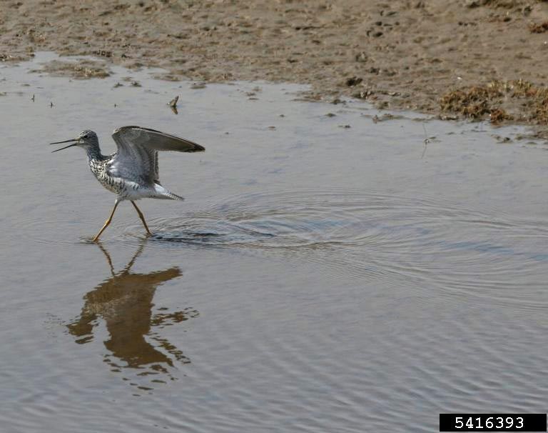 The lesser yellowlegs forages for food by pecking and grabbing up prey from shallow water. It will also chase prey on land. It eats a wide variety of insects and invertebrates including ants, flies, grasshoppers, insect larvae, crustaceans, mollusks and worms. It also eats small fish and seeds.
