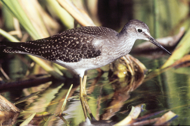 The lesser yellowlegs is a medium sized shorebird that is nine to ten inches in length. It has a long, straight bill; a long neck; and a speckled brown body with a white belly and a gray rump. It gets its name from its very long, bright yellow legs. Males and females look alike.