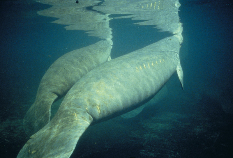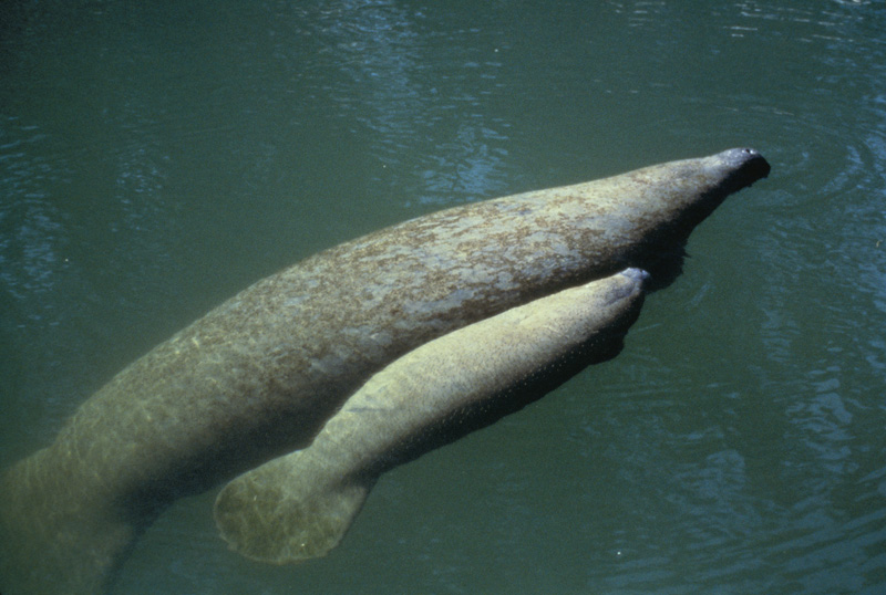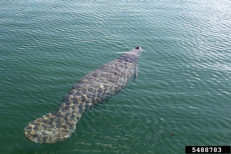 West Indian manateeThe West Indian manatee is an aquatic mammal. It is gray or brown and has a very light covering of fur. It has a broad head with a big upper lip that has short whiskers on it. It has a large, flat, round paddle-like tail and large front flippers. It has no hind flippers or external ears. Adults are about ten feet long and can weigh up to 1,000 pounds.