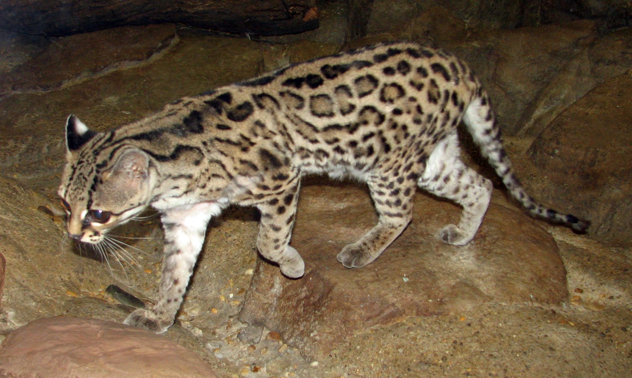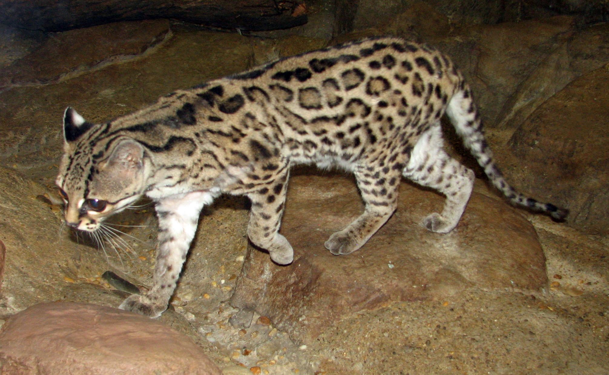MargayThe margay is nocturnal. It is a very good climber and jumper. It has joints in its ankles that rotate 180 degrees. This helps it climb down vertical trees headfirst. It is the only cat in North America that can do that! It can also hang from tree limbs by one hind foot. It spends most of its time in the tree canopy hunting for birds, small mammals, reptiles and eggs.