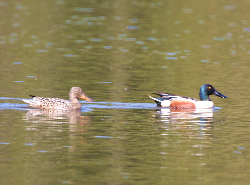 Northern ShovelerThe northern shoveler is a medium-sized dabbling duck. Its most unique feature is its large shovel-shaped bill. During the breeding season, male shovelers have shiny green heads, a white body, rusty-red undersides, and black wings. In non-breeding season their color is a little duller and their head and breast are brown. Male shovelers have yellow eyes and a black bill.