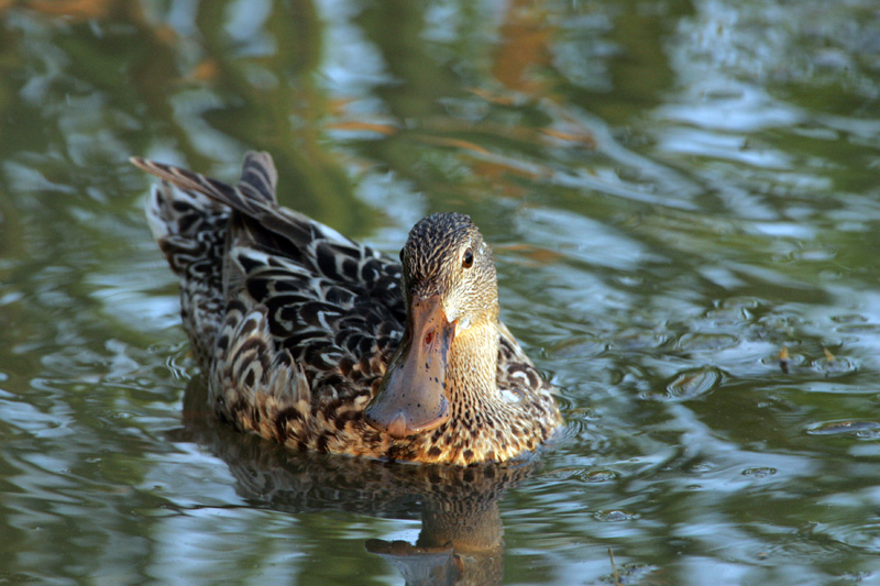 Northern ShovelerFemale northern shovelers have mottled brown, black and white feathers and a blue patch on their wings. Their eyes are brown and their bill is a brownish green.