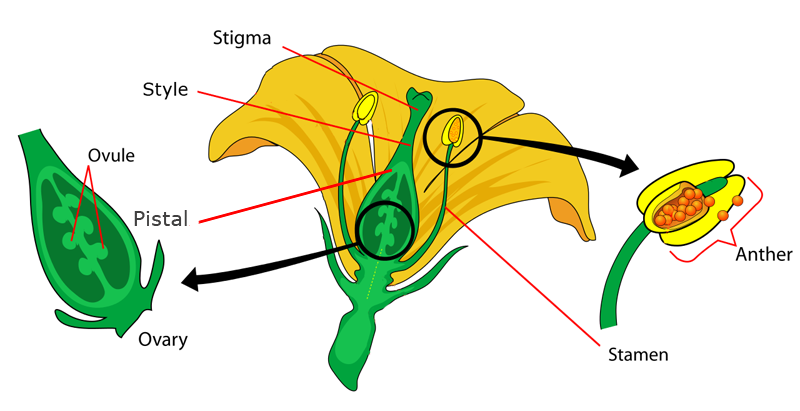 Tawny Day LilyAngiosperms have to undergo a process called pollination before they can reproduce. Angiosperms have male sex organs called stamens. On the end of the stamen is the anther. This is where pollen is made. The pollen has to be taken to the pistil or the female part of the flower. The pollen is left on the stigma at the end of the pistil. The stigma carries the pollen down a tube called the style to the ovary.