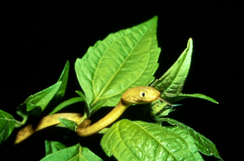 Snakes use their forked tongues to "taste" or collect pheromones of prey animals that are in the air. They have receptors in the roof of their mouths that help them taste and smell the pheromones. |