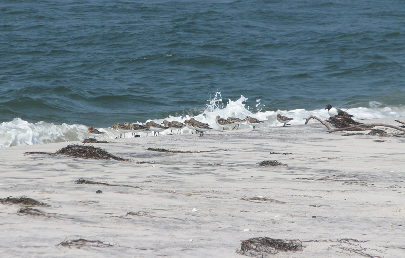 When the tide is out, the sea birds hit the beach looking for food. Curlews, sandpipers and red knots use their sharp bills to poke in the sand for worms and other invertebrates. American oyster catchers use their strong bills to crack open mussels and cockles. Gulls scour the beach searching for crabs and small fish.
