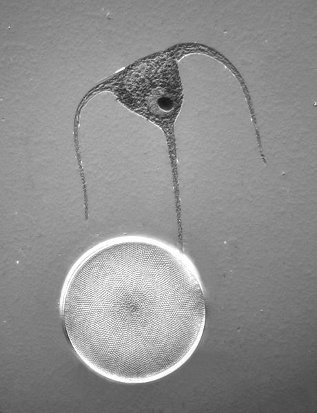 Dinoflagellates are small organisms with two tails or flagella. Dinoflagellates come in all kinds of shapes and sizes. Some have shells and some don't. Not all dinoflagellates rely only on photosynthesis for all their energy. Some wrap themselves around food and absorb it. Some dinoflagellates can make light using bioluminescence.