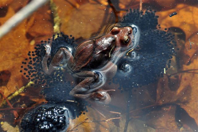 Vernal pools are often breeding grounds for frogs and other amphibians. Some organisms in vernal pools are adapted to survive through the dry season. Algae and protozoans dig into the mud and make a cyst or hard cover out of lime! This protects the organism until water fills the pond in the spring.