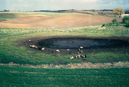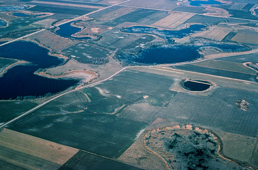 The depressions are all different shapes and sizes. These depressions fill up with water when it rains and when the snow melts. Since most of them are in the prairies and they're often round like a pot, they are called prairie potholes. Some of them are temporary; others are permanent, depending on their size and amount of rainfall.
