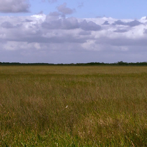 The Florida Everglades is a saw-grass marsh. Saw-grass is a very thick grass with sharp saw-like edges that grows 10-15 feet high. The basin of the Everglades is made of limestone. The limestone makes it hard for water to drain. The Everglades begin at Lake Okeechobee. When the lake overflows, water drains into the Everglades. The Everglades has a dry and a wet season. The dry season runs from December to April. During the dry season, animals that live in the water often migrate to deeper pools of water. Other species that prey on these animals will also move near the pools of water. In the wet season, which runs from May to November, rain fills in the dry areas and wildlife can be found throughout the Everglades. The water level in the Everglades can vary from just a few inches to six feet.