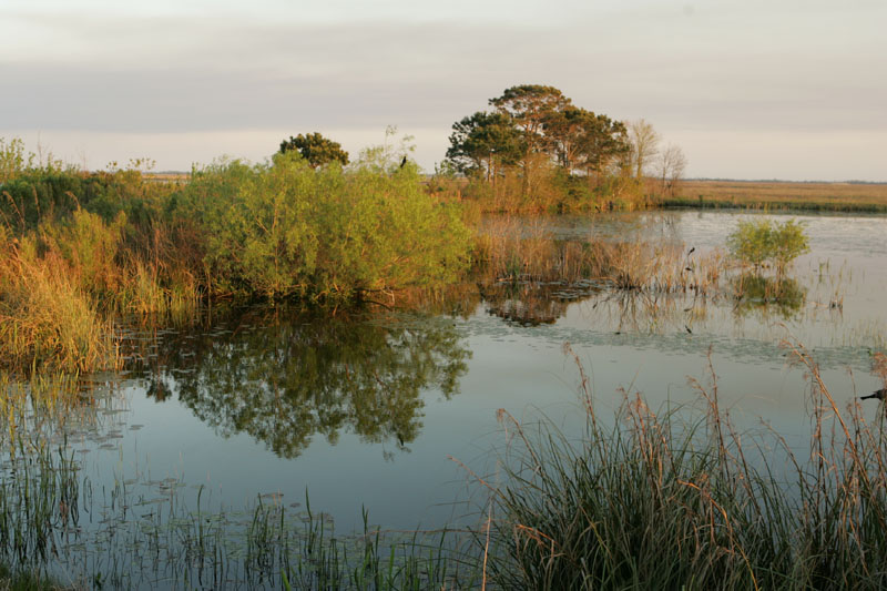 Low-growing plants like grasses and sedges are common in freshwater marshes. Bulrushes and cattails are often found at the edges of a marsh. There are very few trees in freshwater marshes. Animals like mink, raccoons, opossums, muskrats, beavers, frogs, turtles and lots of species of birds and insects are common in marsh lands. Freshwater marshes can vary in size from very small to very large! The largest freshwater marsh in the United States is the Florida Everglades.