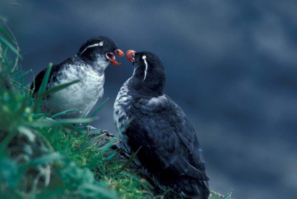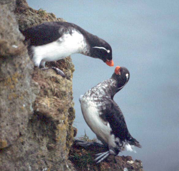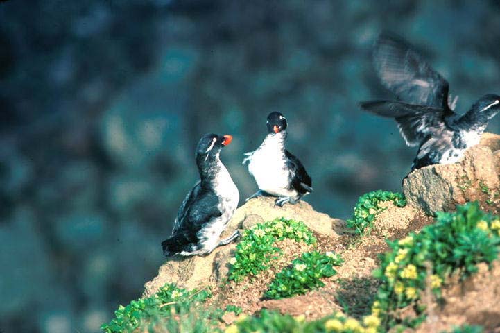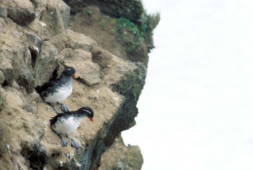 Unlike other auklets, the parakeet auklet doesn't nest in large colonies. One parakeet auklet will sit on a cliff ledge near its nest and watch for danger, while the other auklet incubates the egg or tends to the chick.