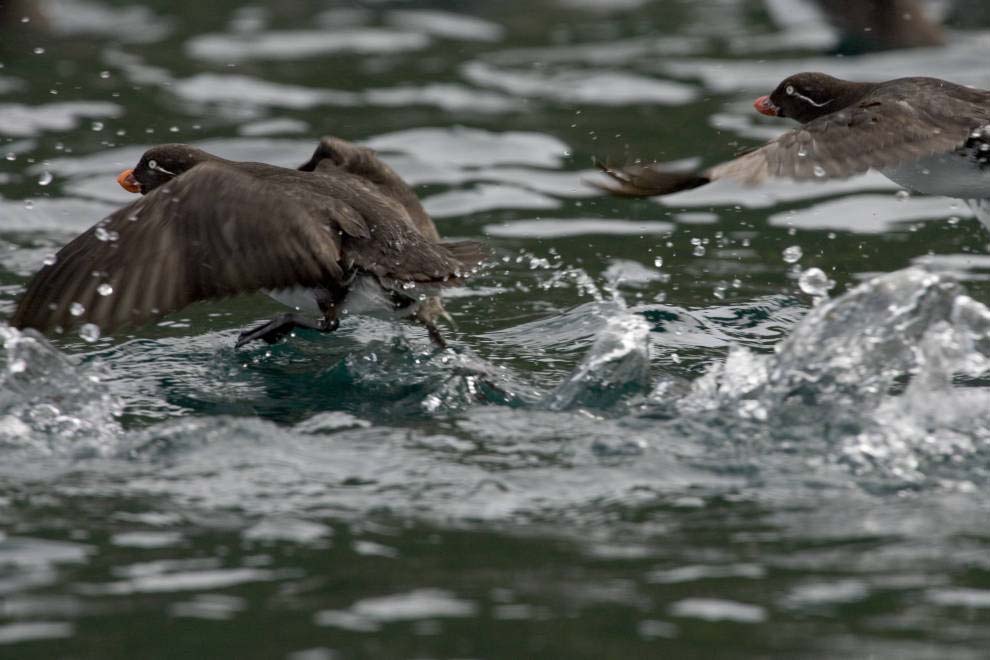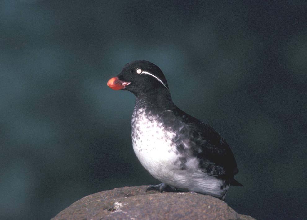 The parakeet auklet dives for krill. Sometimes it eats small fish.