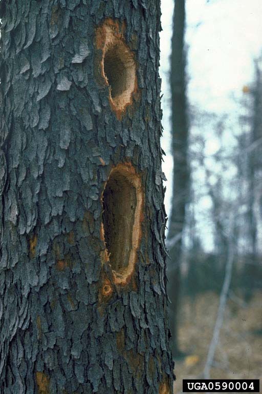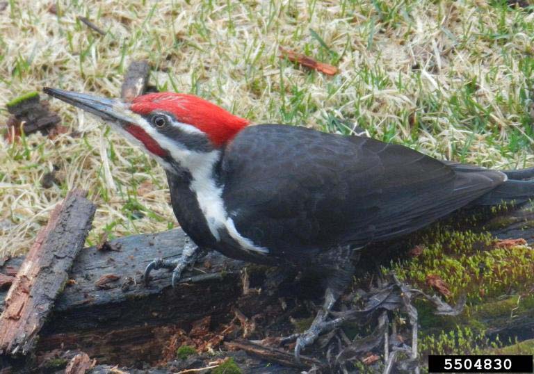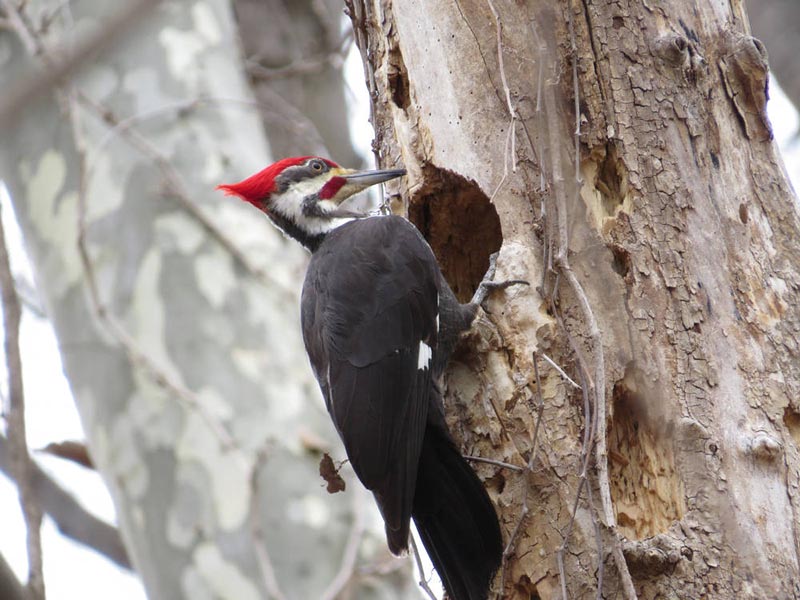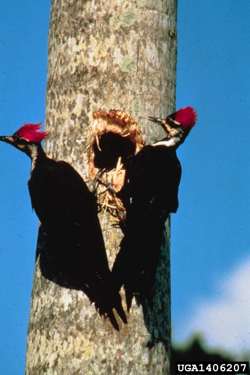 Although the pileated woodpecker is adapted to clinging to the sides of trees, it is a strong flyer and it will even sometimes hop around on the ground. The pileated woodpecker "drums" on hollow trees with its bill to claim territory.