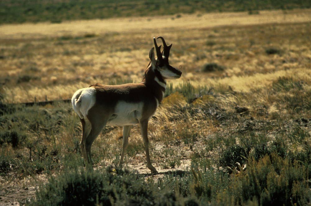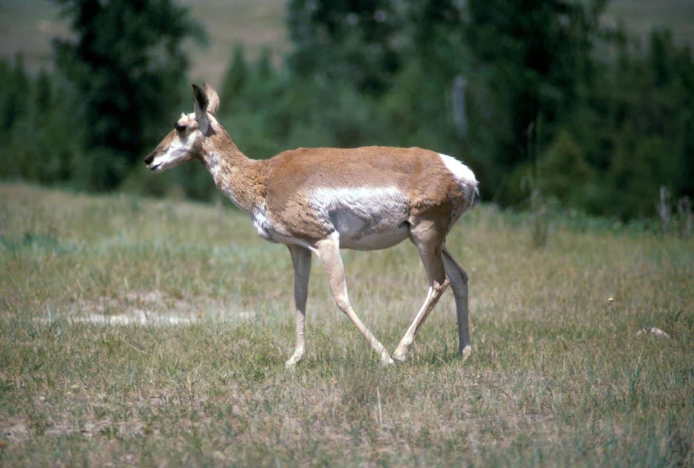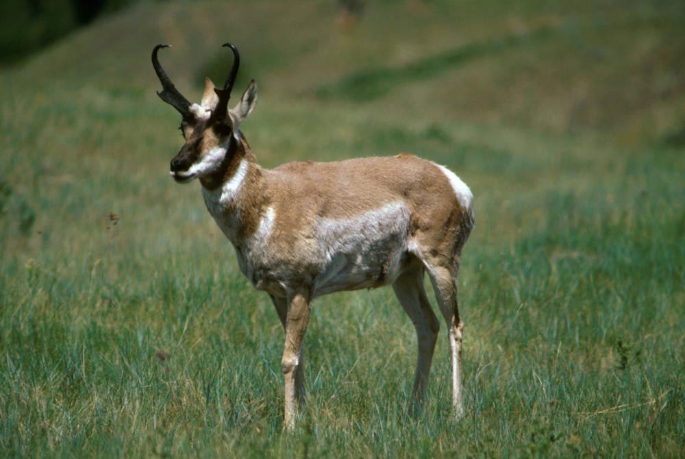 PronghornThe pronghorn has a deer-like body. It weighs between 90 and 120 pounds and stands about 31/2 feet tall from shoulder to feet. It has a tan to reddish brown body. Its cheeks, belly, rump, chest and inner legs are white. Males have a broad black mask that runs from their eyes down their snout to their nose, black neck patches and pronged black horns that are 12-20 inches long. The male's horns are lyre-shaped and curve in towards each other.