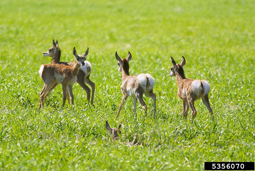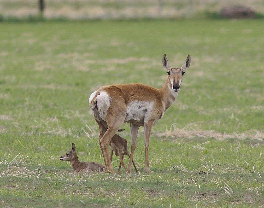 PronghornThe fawns are almost odorless at birth. This helps protect them from predators. They will stay hidden in the grass for the first few days. Their mother will graze away from where she has hidden her fawns so that she doesn't attract predators to where they are hidden. The fawns will join the herd when they are about a week old and they begin grazing when they are three weeks old. They can run faster than a human when they are just four days old!