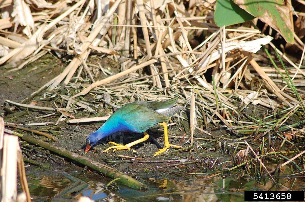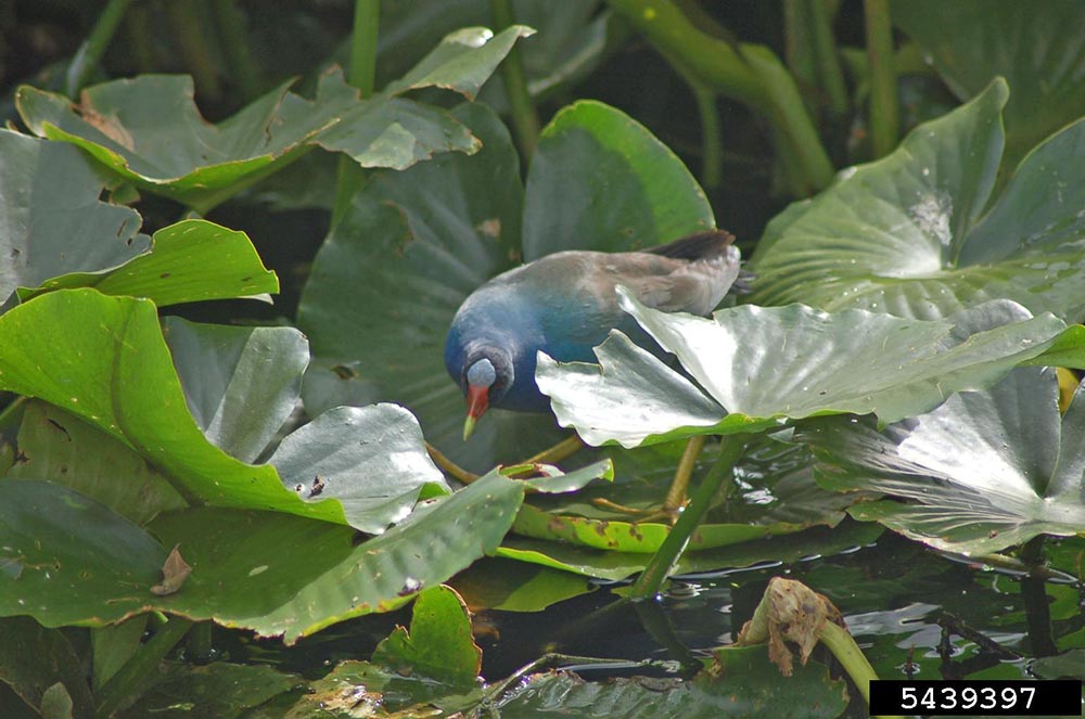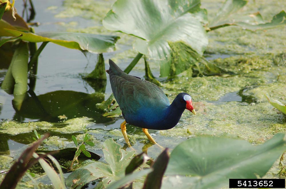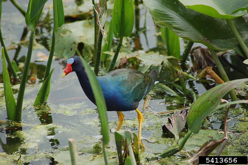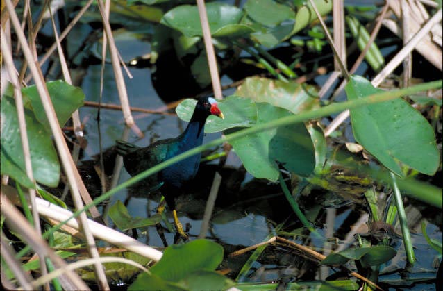 The purple gallinule lives in freshwater marshes with aquatic vegetation like lily pads and pickerelweed.