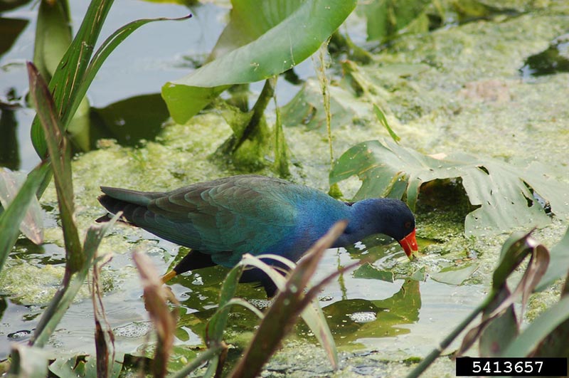 The purple gallinule eats a wide variety of foods including frogs, grasshoppers, dragonflies, spiders and water plants.