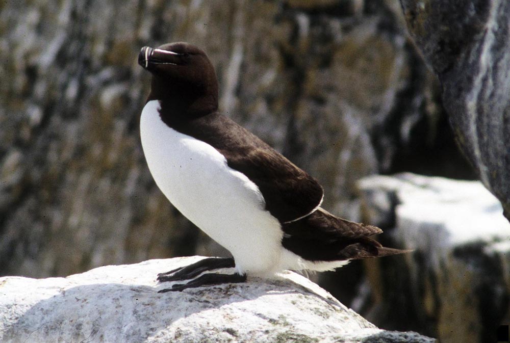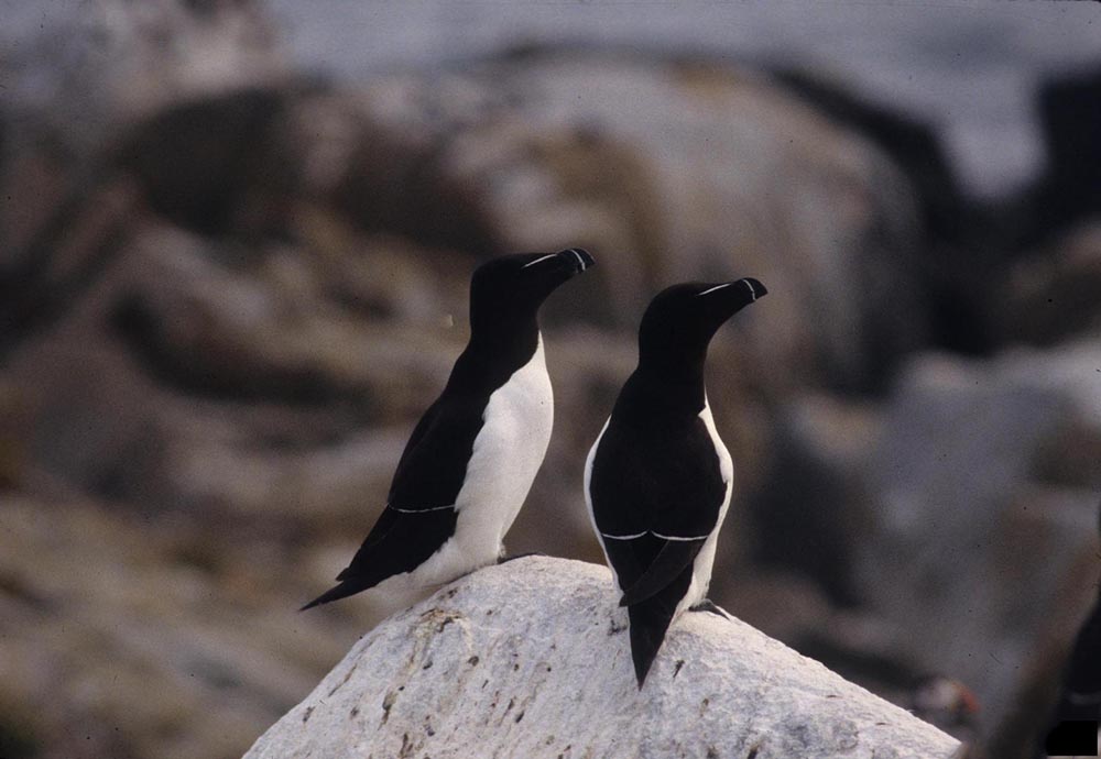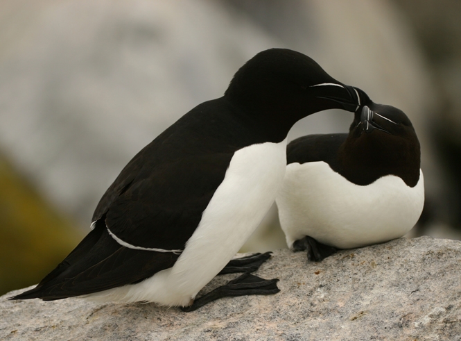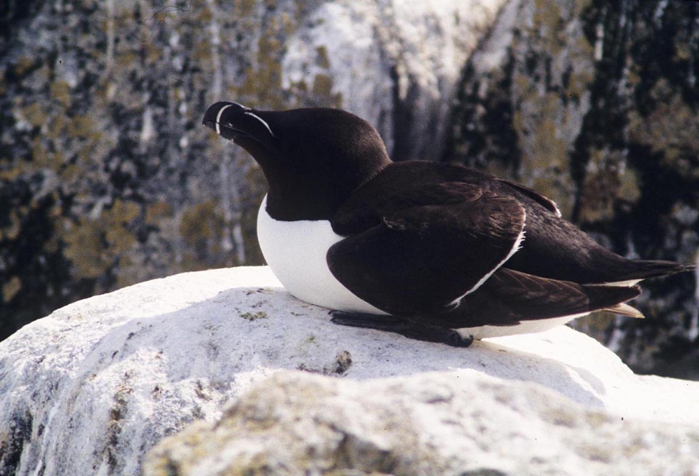 The razorbill nests in colonies on cliffs or islands among the boulders and rocks. The female razorbill lays a single egg on the ground or on rocks. Incubation takes about five weeks. The chick stays in the nest for 16-25 days, then it goes out to sea with its parents. It will take another two months before it reaches adult size and has adult plumage.