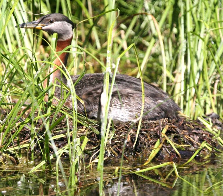 The red-necked grebe is a medium-sized aquatic bird that is 13-17 inches in length with a wingspan of around 32 inches. It has a long neck; a straight, long black bill that is yellow at the base; and black legs and feet that are set far back on its body. It has a black cap, grayish-white cheeks, and a brown body. During breeding season it has a rusty red neck and breast. In the non-breeding season it has a gray neck and breast. Young red-necked grebes have black and white zebra-striped heads and necks. Males and females look alike, but males are a little larger.