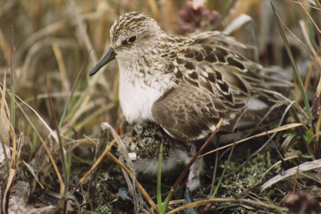Males arrive on the arctic breeding grounds in late May, usually a few days before the females. The males establish a territory and then try to attract a mate with aerial displays that include hovering and the air and calling out with sharp cries.