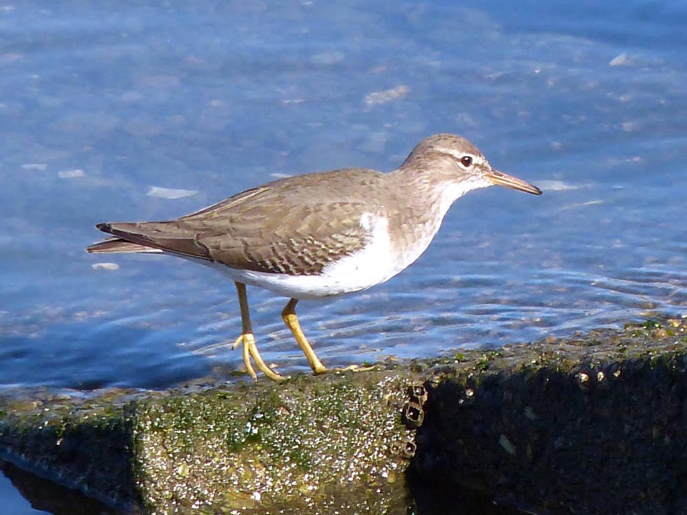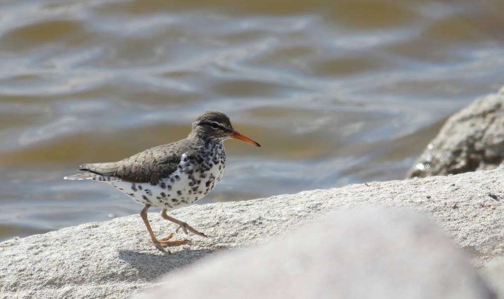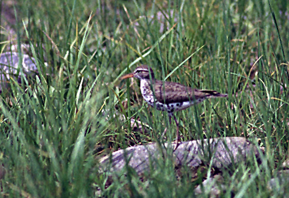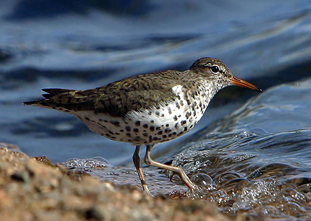 The spotted sandpiper is about six to seven inches in length. It has a white line over its eyes and long yellowish or pinkish legs.In breeding season, it is brown above and white below with dark brown spots on its chest and belly. Its bill is a bright orange with a black tip.