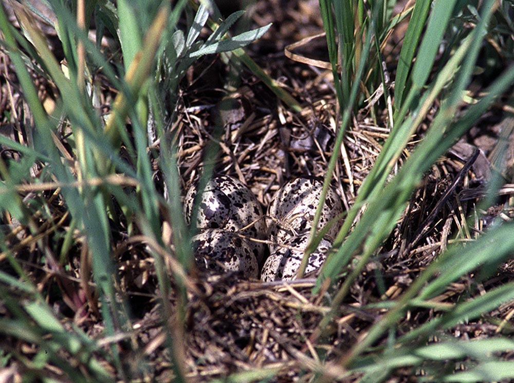 The female lays four eggs in a grass and moss-lined nest made in a depression in the ground. The female may mate with more than one male, and she may lay eggs for each of them!